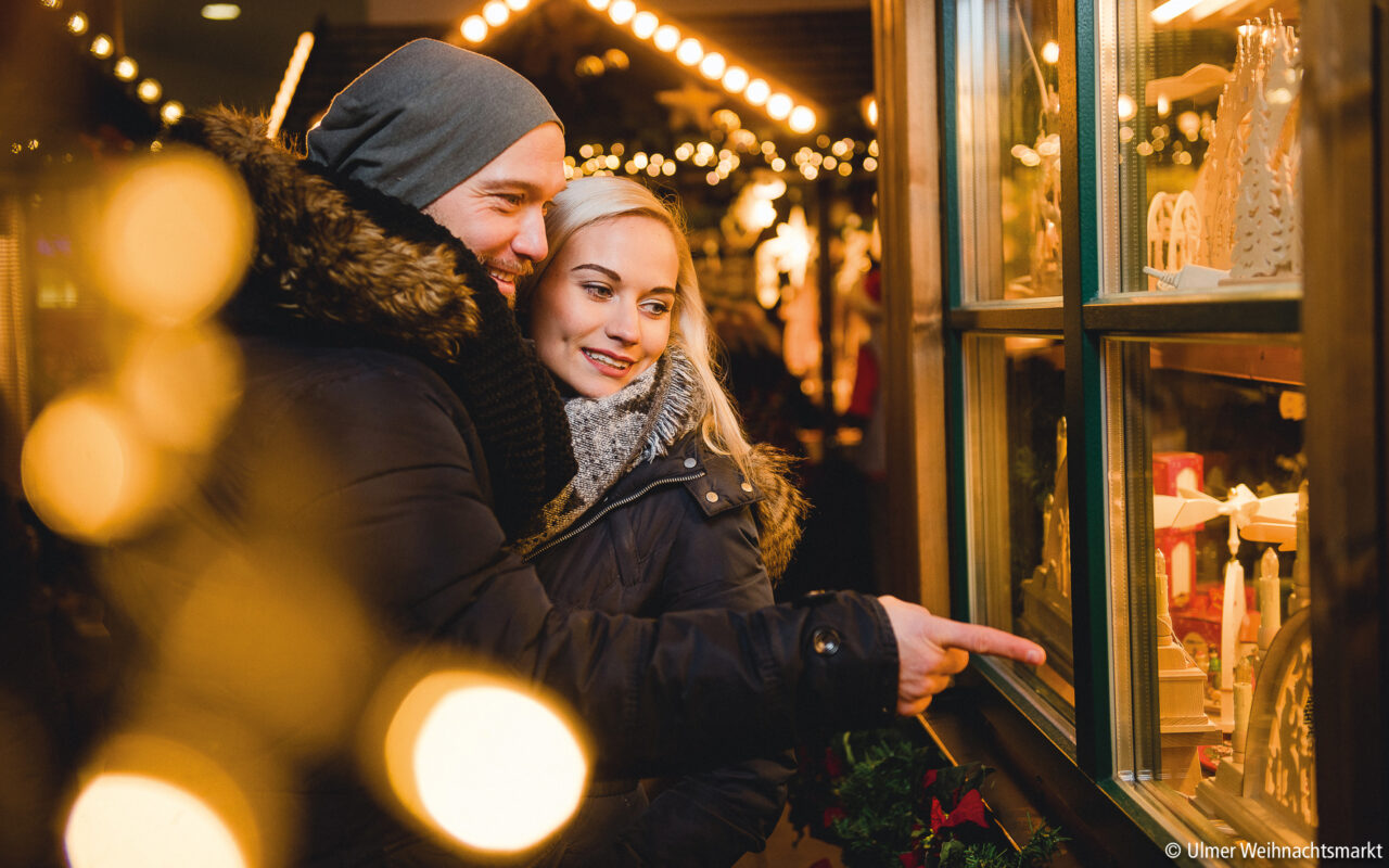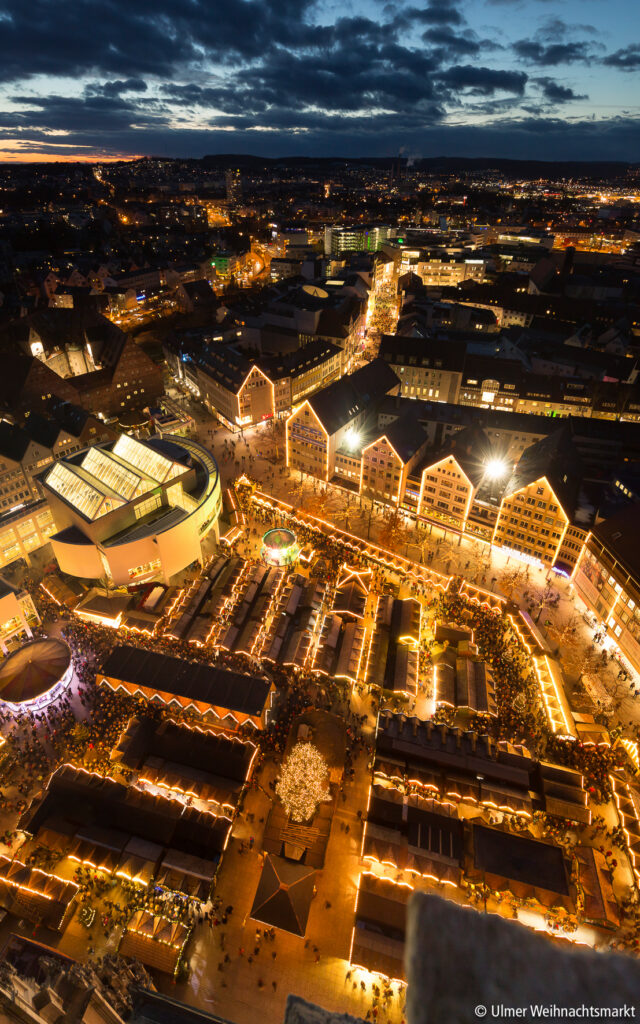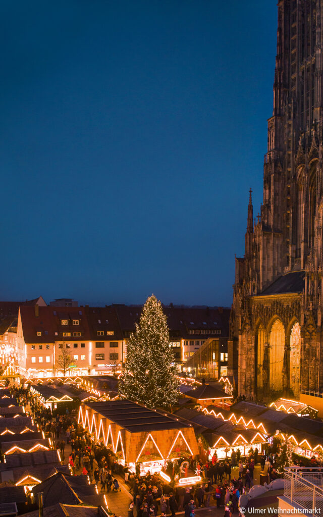Stimmungsvoll platziert auf dem Münsterplatz, direkt vor dem höchsten Kirchturm der Welt, verwandeln festlich dekorierte Holzbuden den Weihnachtsmarkt in eine kleine Stadt, in der Stadt.